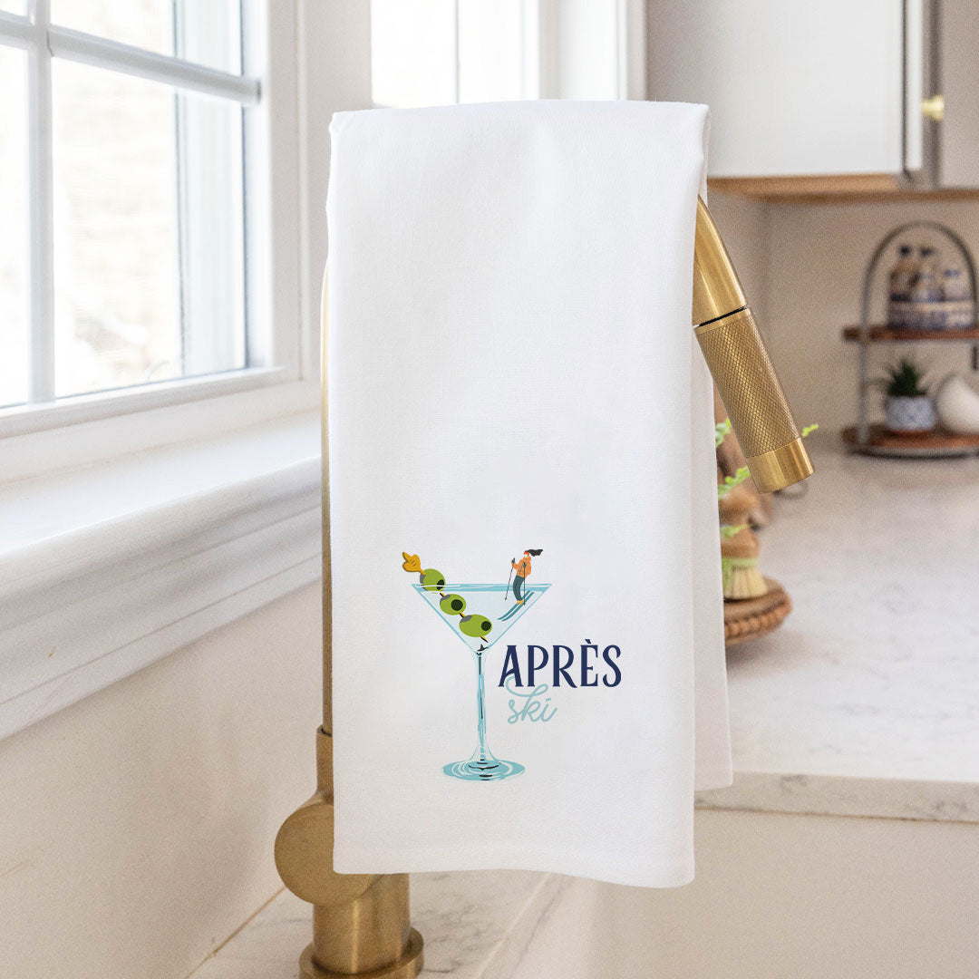 Elevate your après-ski gatherings with this charming Apres Ski Martini Tea Towel. Perfect for adding a touch of winter whimsy to your kitchen or bar area, this towel is both functional and stylish. Its playful design featuring a martini glass with a skier is sure to spark conversation and bring a smile to your guests' faces. Whether you're drying dishes or displaying it as a decorative piece, this tea towel is a delightful addition to any home.