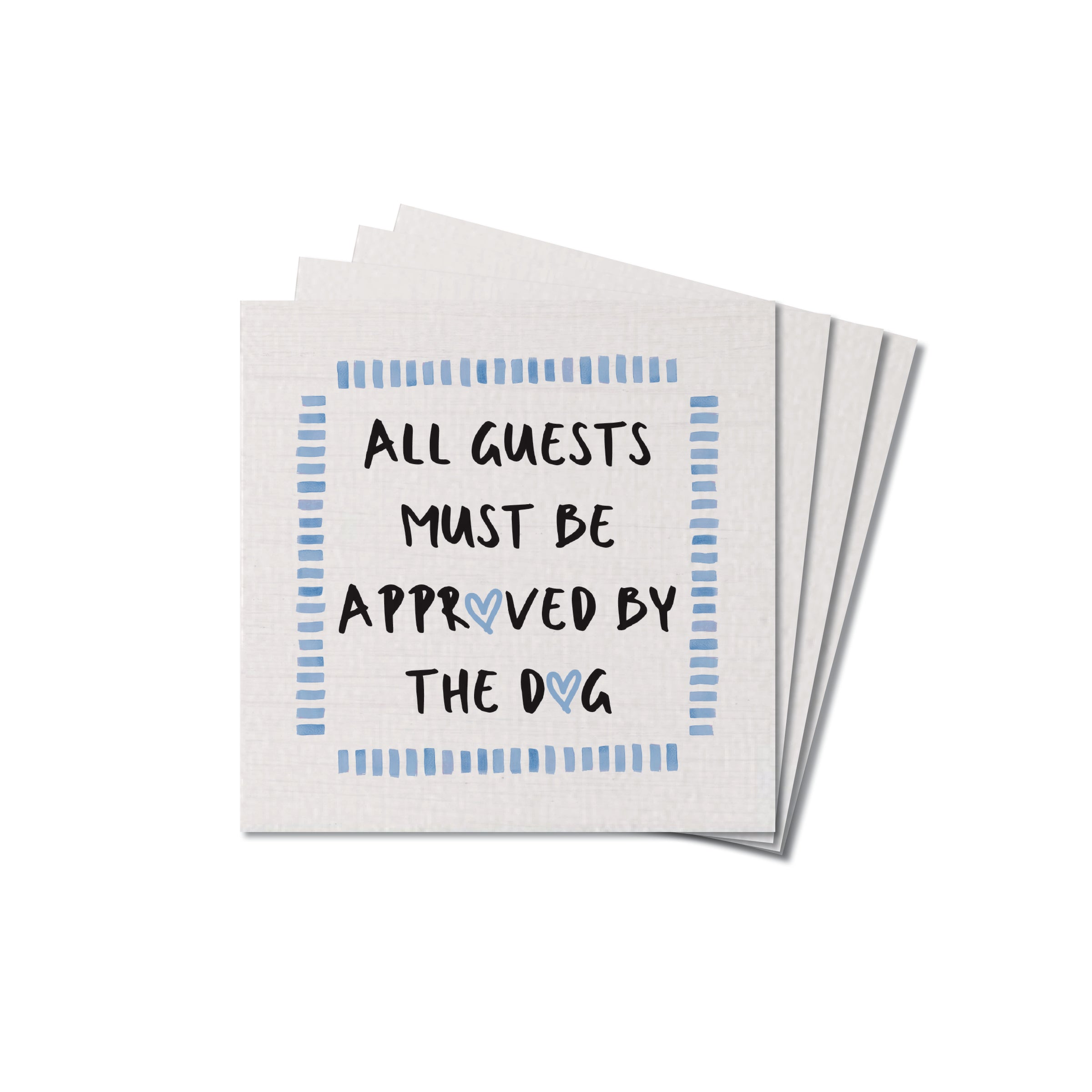 Crafted from durable materials, each coaster features a whimsical message that reads, "All Guests Must Be Approved By The Dog," surrounded by a subtle blue border. The set includes four coasters, ensuring ample coverage for your coffee table or dining area. Easy to clean and maintain, these coasters are both practical and stylish. Perfect as a gift for dog enthusiasts, they blend functionality with a lighthearted touch.