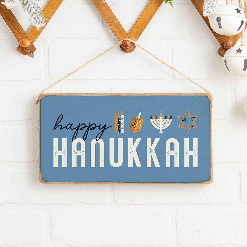 Crafted with care, this Hanukkah twine sign features a soothing blue background adorned with festive symbols like menorahs, dreidels, and candles. The durable materials ensure it will be a cherished part of your holiday traditions for years to come. Its compact size makes it suitable for various spaces, while the elegant typography adds a touch of style. Perfect for gifting or personal use, this sign is a must-have for your Hanukkah decorations.