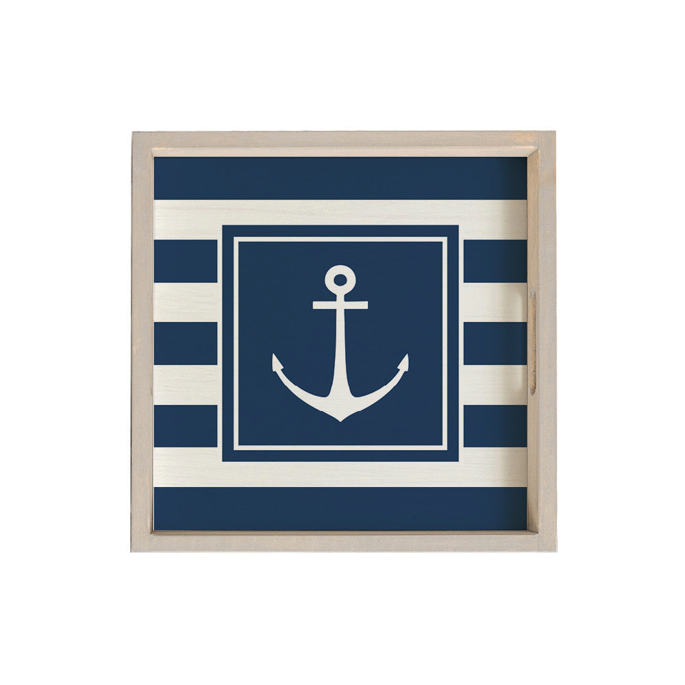 Crafted with a sturdy wooden frame, this serving tray features a striking navy and white anchor design, complemented by bold stripes. The durable construction ensures long-lasting use, while the easy-to-clean surface makes maintenance a breeze. Whether displayed as a twine sign or used for serving, this tray seamlessly blends functionality with style. Ideal for beach houses, coastal kitchens, or nautical-themed rooms, it’s a perfect addition to your home decor collection.